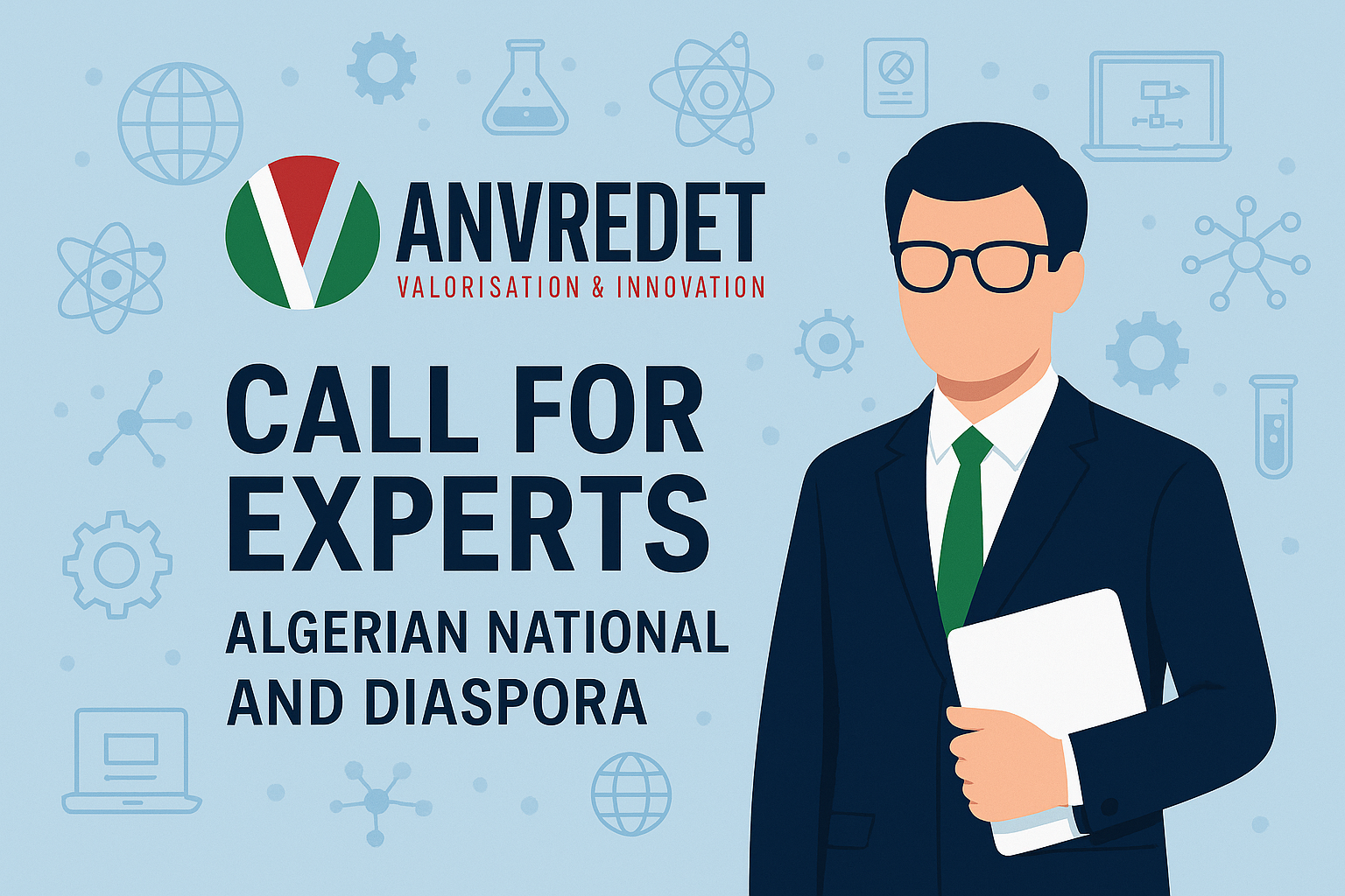 Bienvenue sur le site officiel de l’Agence Nationale de Valorisation des Résultats de la Recherche et du Développement Technologique (ANVREDET). À l’heure où l’innovation transforme profondément les économies et les sociétés, l’ANVREDET se positionne comme un acteur clé de la transformation des idées en solutions concrètes au service du développement de l’Algérie. Notre ambition est claire : connecter la recherche à l’entreprise, accélérer le transfert de technologie, soutenir l’entrepreneuriat innovant et accompagner les talents dans la création de projets à fort impact économique, social et technologique. L’ANVREDET agit comme un catalyseur d’innovation, en fédérant chercheurs, startups, entreprises, institutions et partenaires autour d’un même objectif : faire émerger des projets utiles, durables et compétitifs, capables de créer de la valeur, de l’emploi et du progrès. À travers nos programmes, nos dispositifs d’accompagnement et nos partenariats, nous construisons un écosystème agile, ouvert et collaboratif, où la recherche devient un moteur réel de croissance et de développement. Explorez nos actions, nos opportunités et nos services. Rejoignez la dynamique. Transformons ensemble la recherche en impact. La Directrice Générale ANVREDET