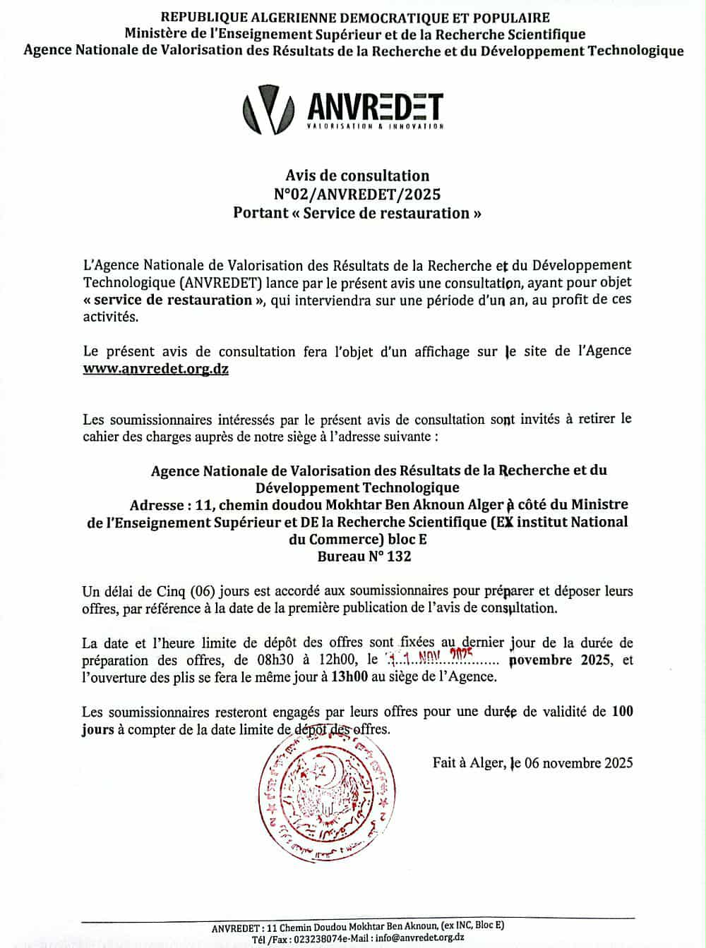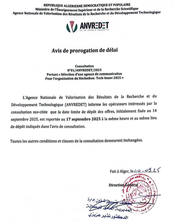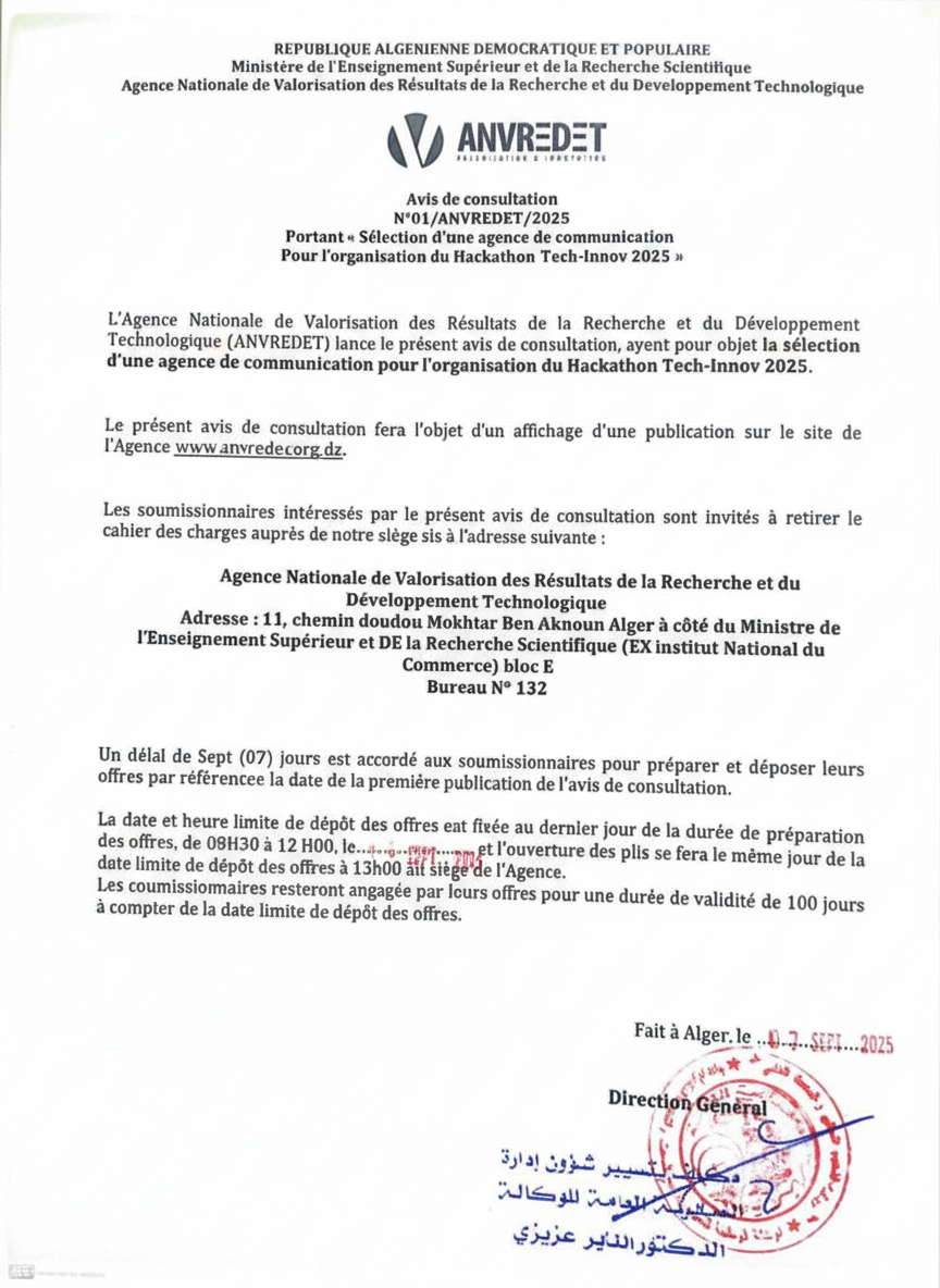 L’Agence Nationale de Valorisation des Résultats de la Recherche et du Développement Technologique (ANVREDET) lance un appel à soumission ....