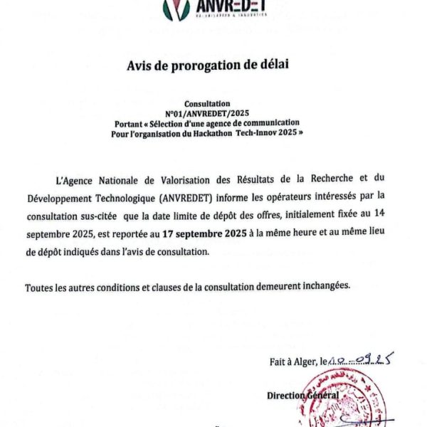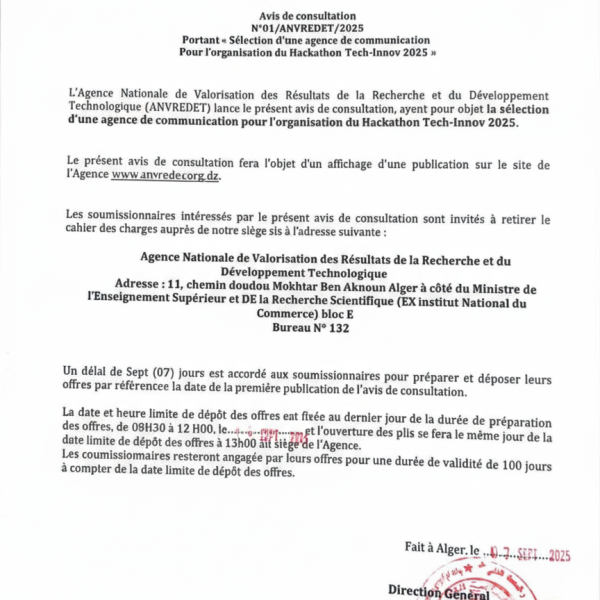 Lancement de l’avis de consultation pour l’organisation de l’Innov-Tech Hackathon 2025Anvredetseptembre 8, 2025Lancement de l’avis de consultation pour l’organisation de l’Innov-Tech Hackathon 2025 L’Agence Nationale de Valorisation des Résultats ... Read More