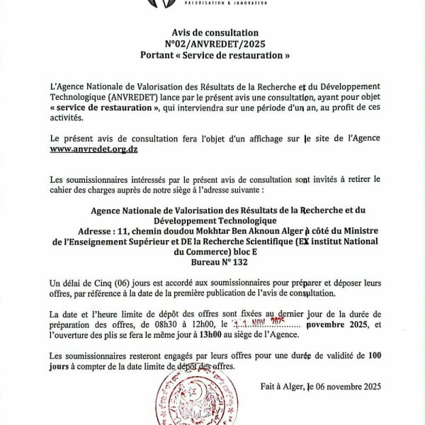 Avis de consultation N°02/ANVREDET/2025 – Service de restaurationAnvredetnovembre 6, 2025Avis de consultation N°02/ANVREDET/2025 Portant « Service de restauration » L’Agence Nationale de Valorisation des Résultats de ... Read More